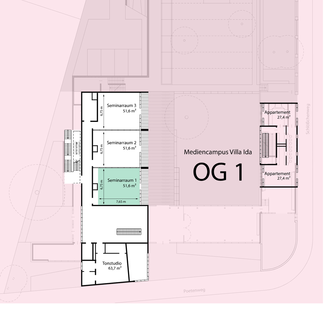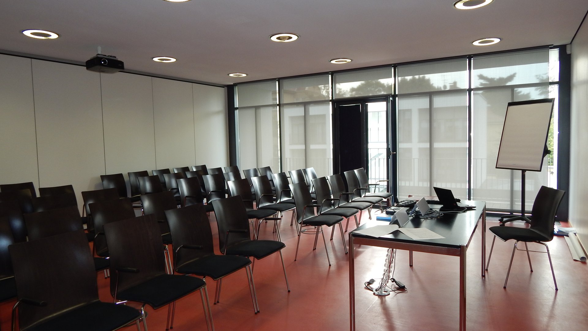 Der Seminarraum 1 liegt im 1. Obergeschoss des Mediencampus. Seine flexible Bestuhlung und die technische Ausstattung ermöglichen Veranstaltungen für bis zu 40 Teilnehmer. Vom Seminarraum 1 hat man einen Zugang zum Balkon mit Blick auf die Villa Ida und in den Garten des Mediencampus. Der Seminarraum ist verdunkelbar und besitzt eine Klimaanlage.