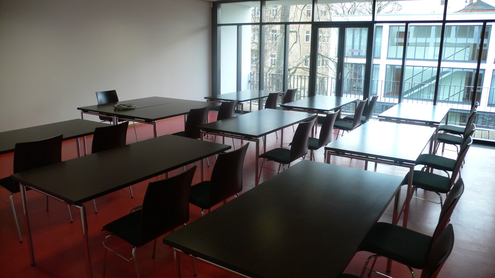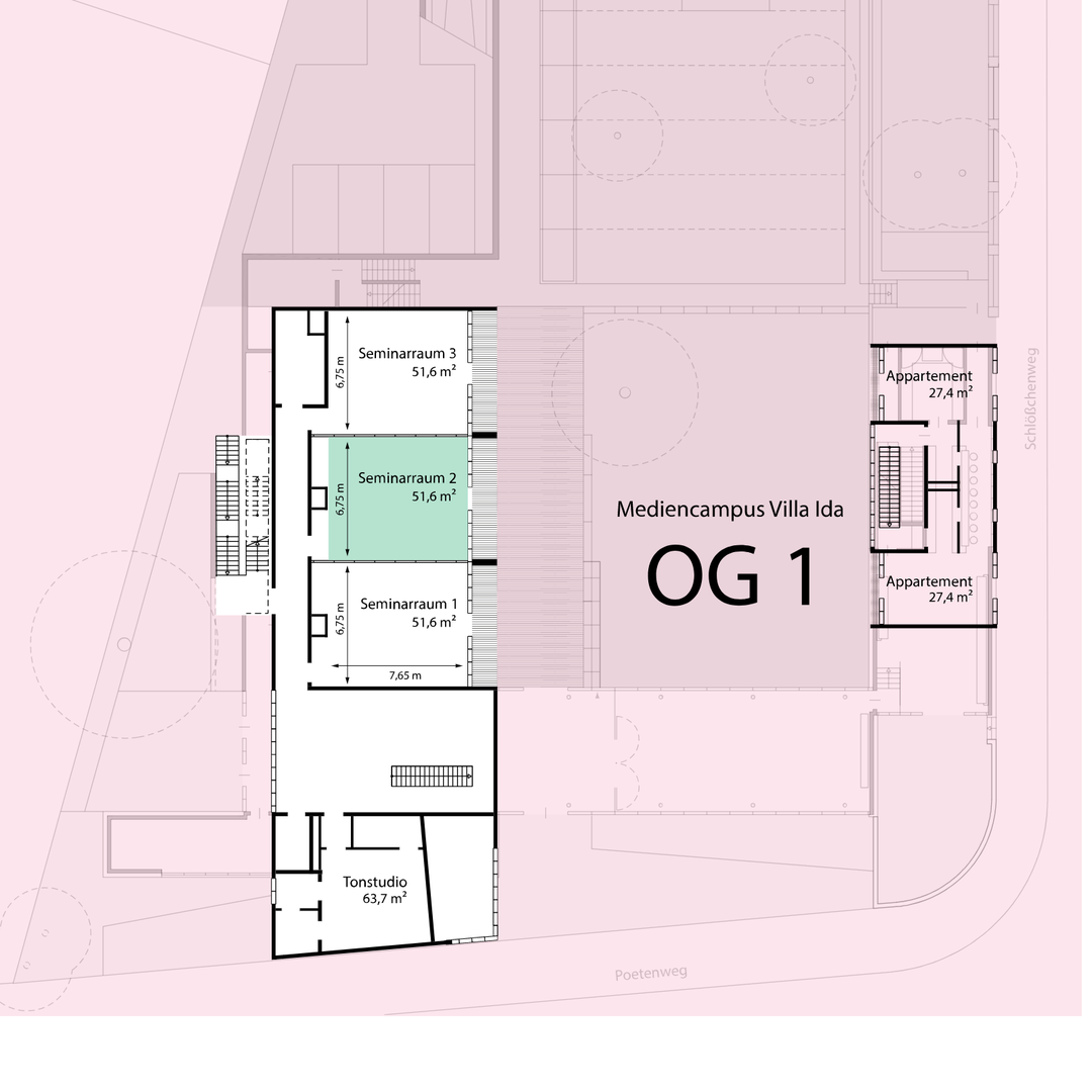 Der Seminarraum 2 liegt im 1. Obergeschoss des Mediencampus. Seine flexible Bestuhlung und die technische Ausstattung ermöglichen Veranstaltungen für bis zu 40 Teilnehmer. Vom Seminarraum 2 hat man einen Zugang zum Balkon mit Blick auf die Villa Ida und in den Garten des Mediencampus. Der Seminarraum ist verdunkelbar und besitzt eine Klimaanlage.
