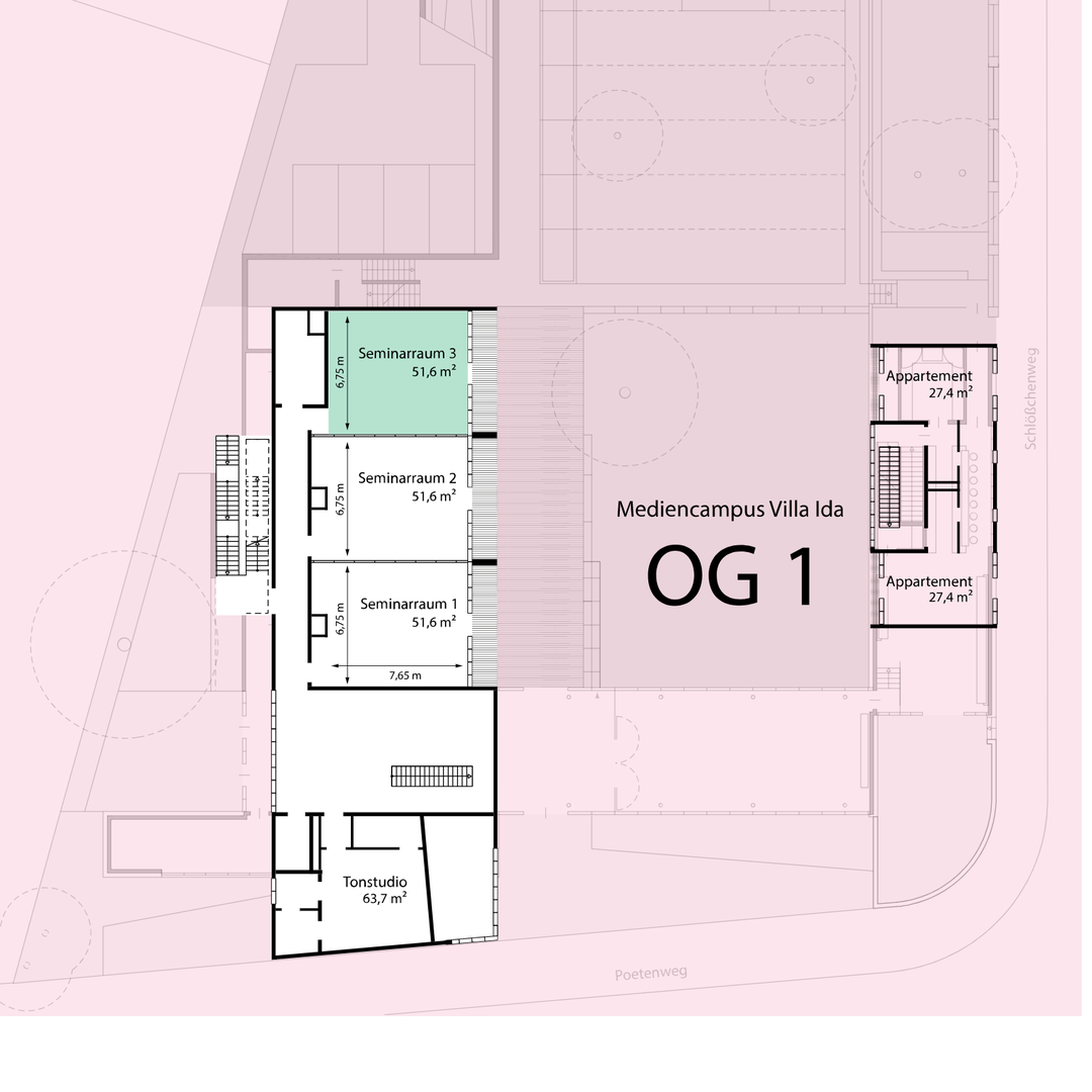 Der Seminarraum 3 liegt im 1. Obergeschoss des Mediencampus. Seine flexible Bestuhlung und die technische Ausstattung ermöglichen Veranstaltungen für bis zu 40 Teilnehmer. Vom Seminarraum 3 hat man einen Zugang zum Balkon mit Blick auf die Villa Ida und in den Garten des Mediencampus. Der Seminarraum ist verdunkelbar und besitzt eine Klimaanlage.