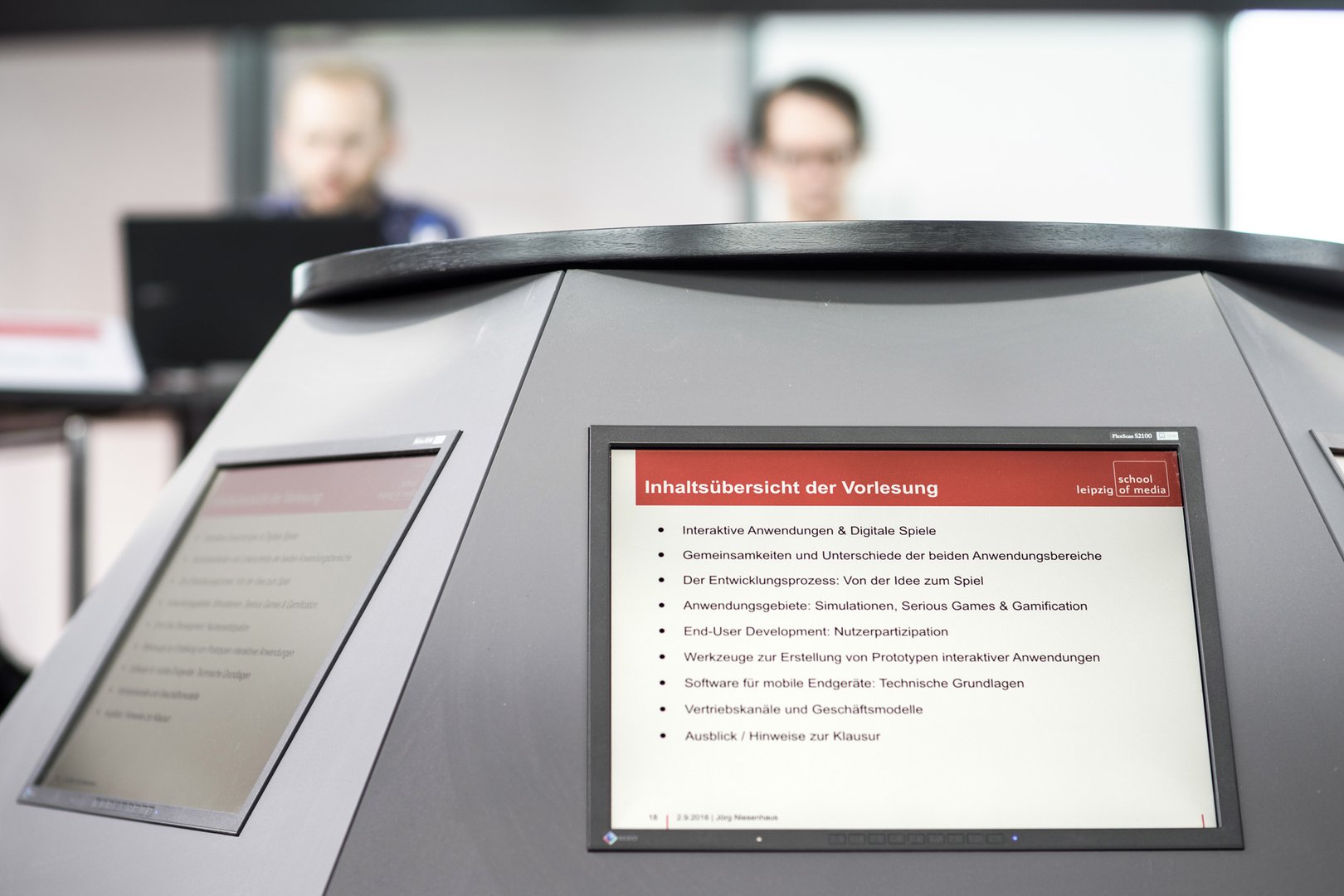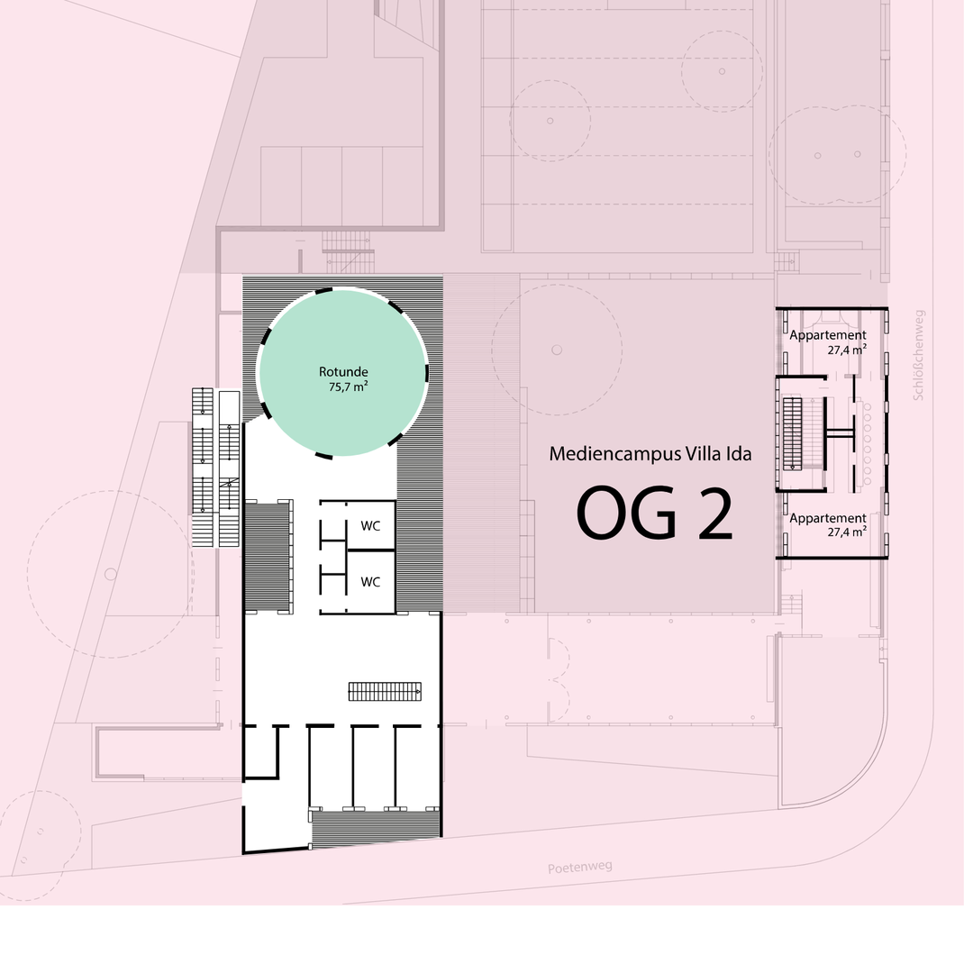 Im 2. Obergeschoss des Mediencampus befinden sich das Campusmanagement und die Büros der Leipzig School of Media. Zudem steht für Seminare und andere Veranstaltungen die Rotunde zur Verfügung.
