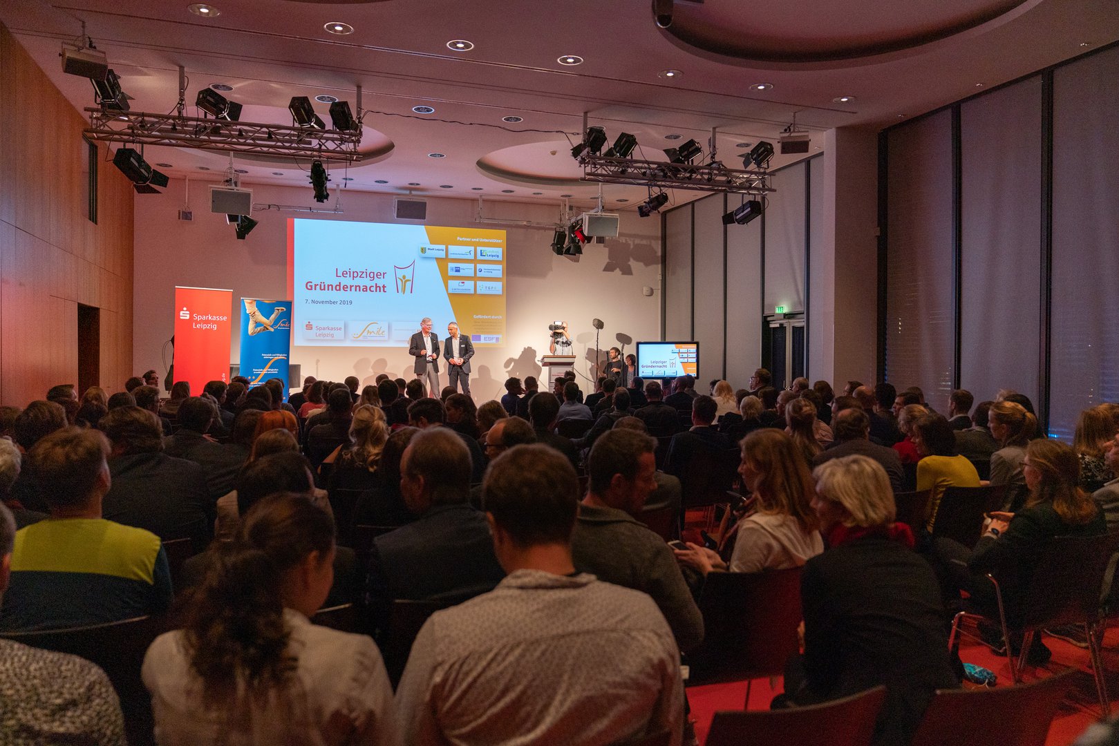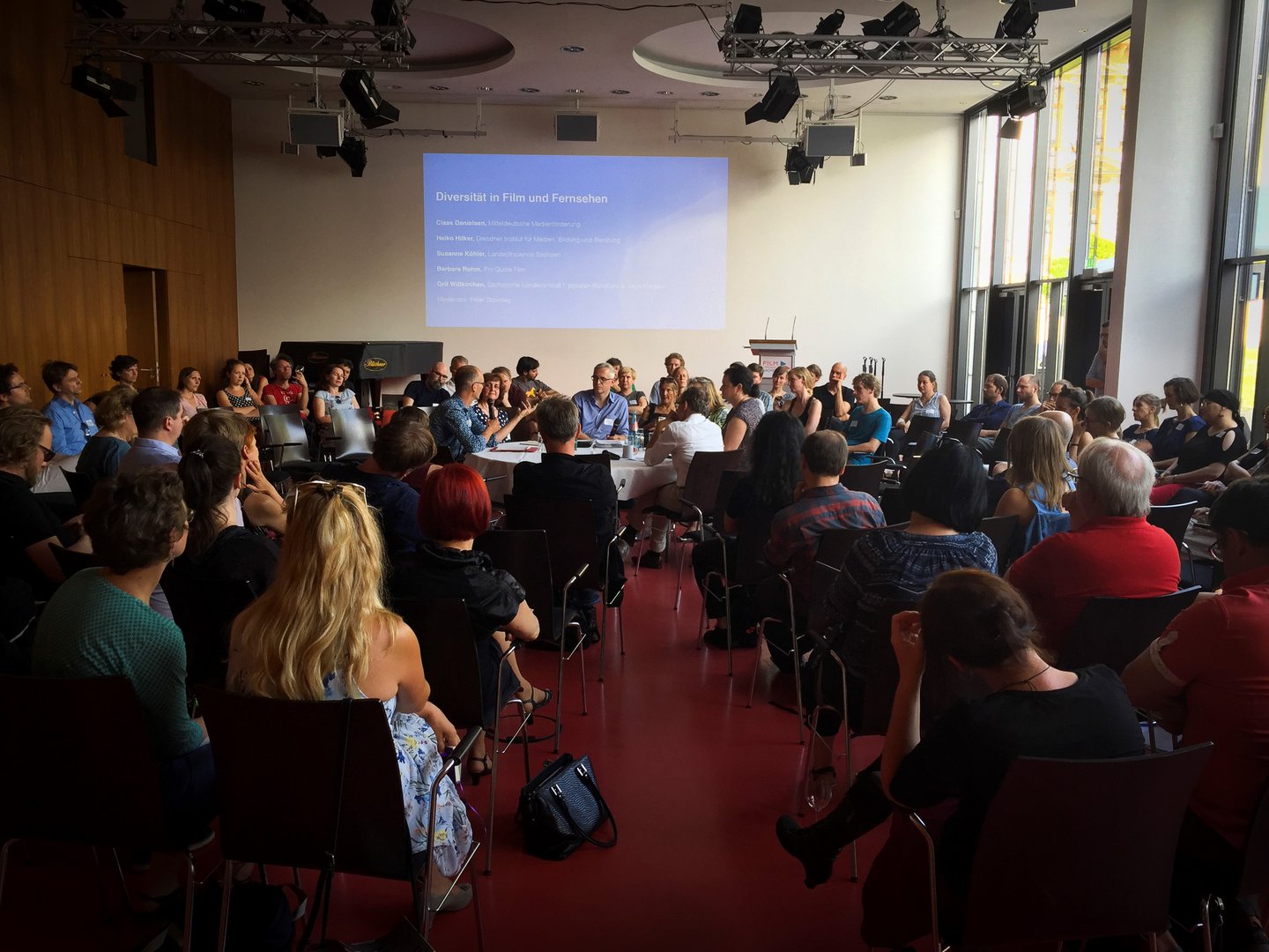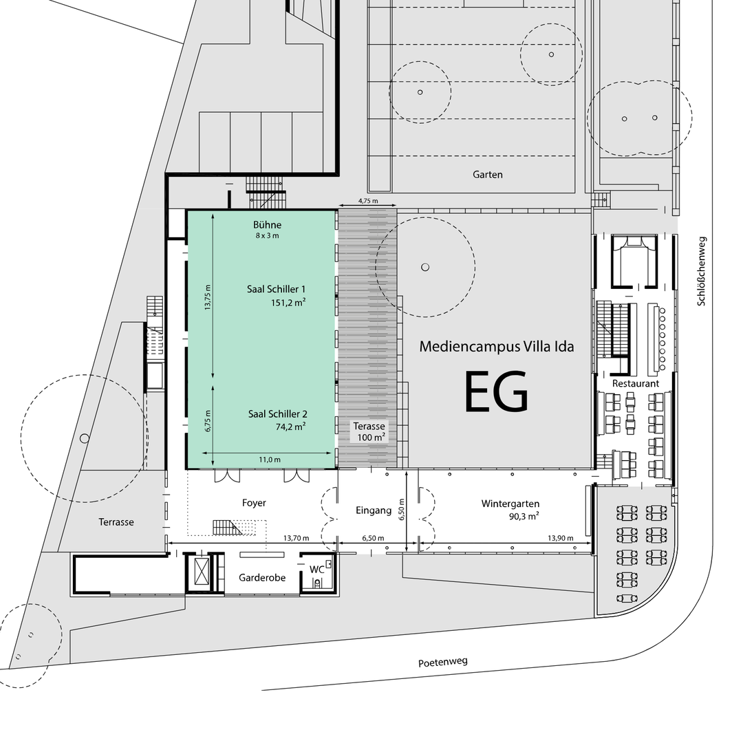 Schillersaal 1+2 im Erdgeschoss des Mediencampus Villa Ida der Medienstiftung der Sparkasse Leipzig bietet sich dank seiner flexiblen Bestuhlung und mit seiner technischen Ausstattung insbesondere für Konferenzen, größere Seminare, Vorträge und kulturelle Veranstaltungen für bis zu 200 Teilnehmer zur Nutzung an. Schillersaal 1+2 ist über einen Korridor mit dem Foyerbereich verbunden. Darüber hinaus verfügt Schillersaal 1+2 über direkte Zugänge zur Terrasse am Garten des Mediencampus. Die Rückwand zum Foyerbereich kann auf Wunsch entfernt werden - beispielsweise für Stehempfänge.