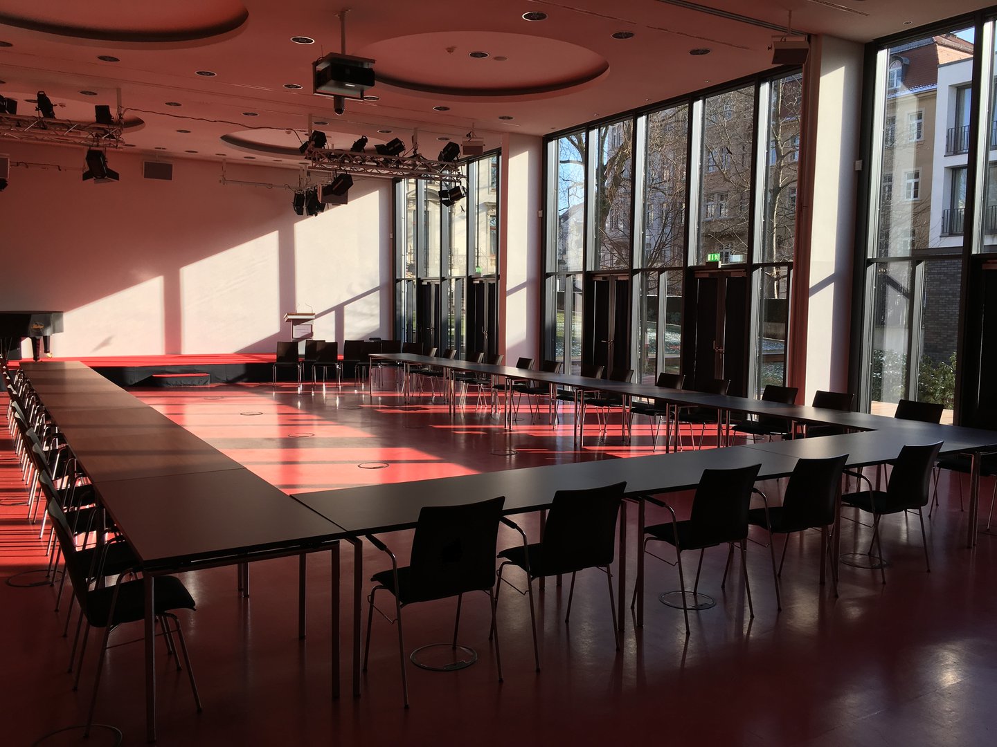 - Bestuhlung mit Tischen in U-Form: 42 Sitzplätze