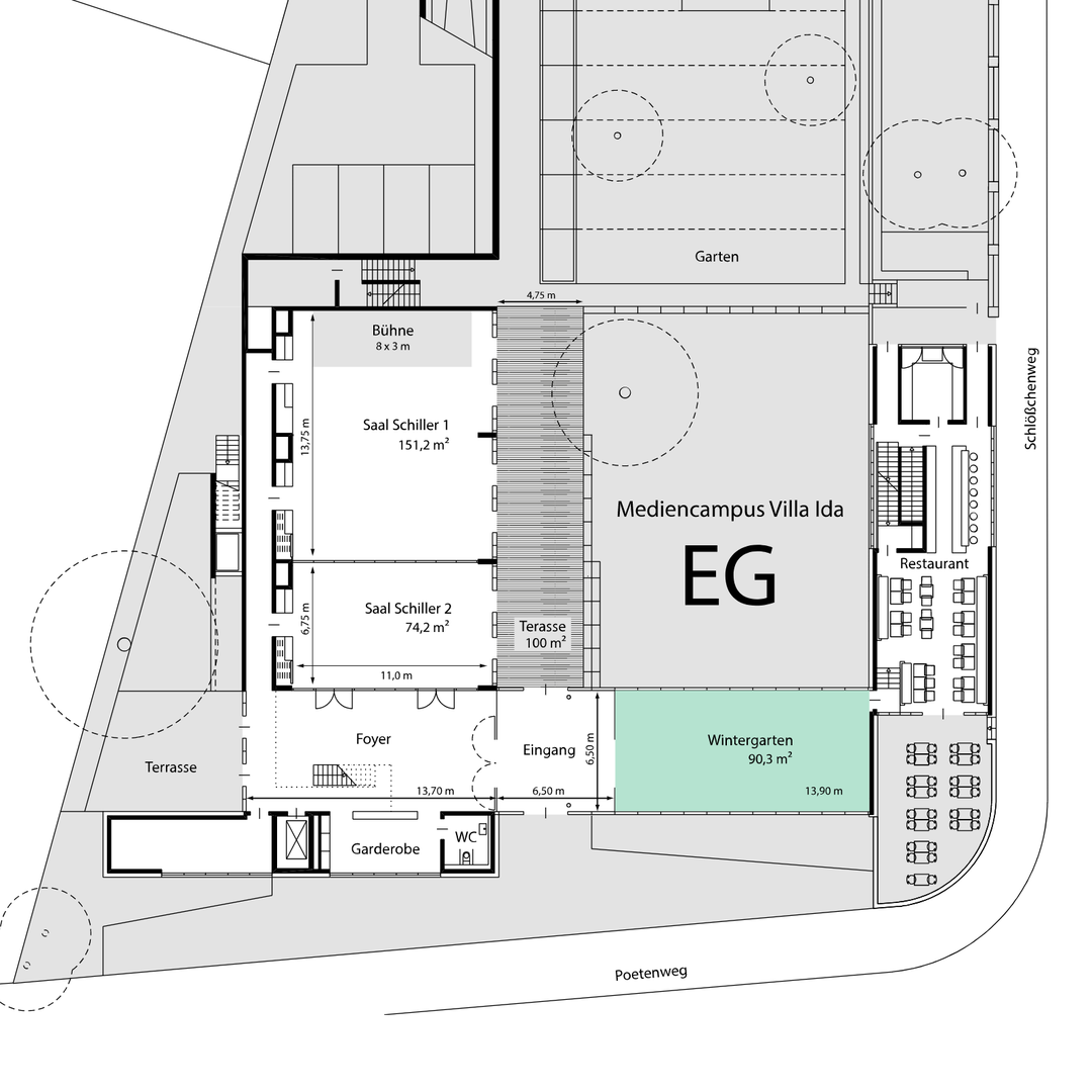 Der Wintergarten im Erdgeschoss des Mediencampus Villa Ida der Medienstiftung der Sparkasse Leipzig bildet den optischen Übergang zwischen Konferenz- und Seminargebäude sowie der "Eventbar Ida" und kann eigenständig für Veranstaltungen genutzt werden. Mit seiner Lage und Ausstattung bietet sich insbesondere eine Nutzung als Cateringbereich während Veranstaltungen oder als Ausstellungs- und Präsentationsfläche an.